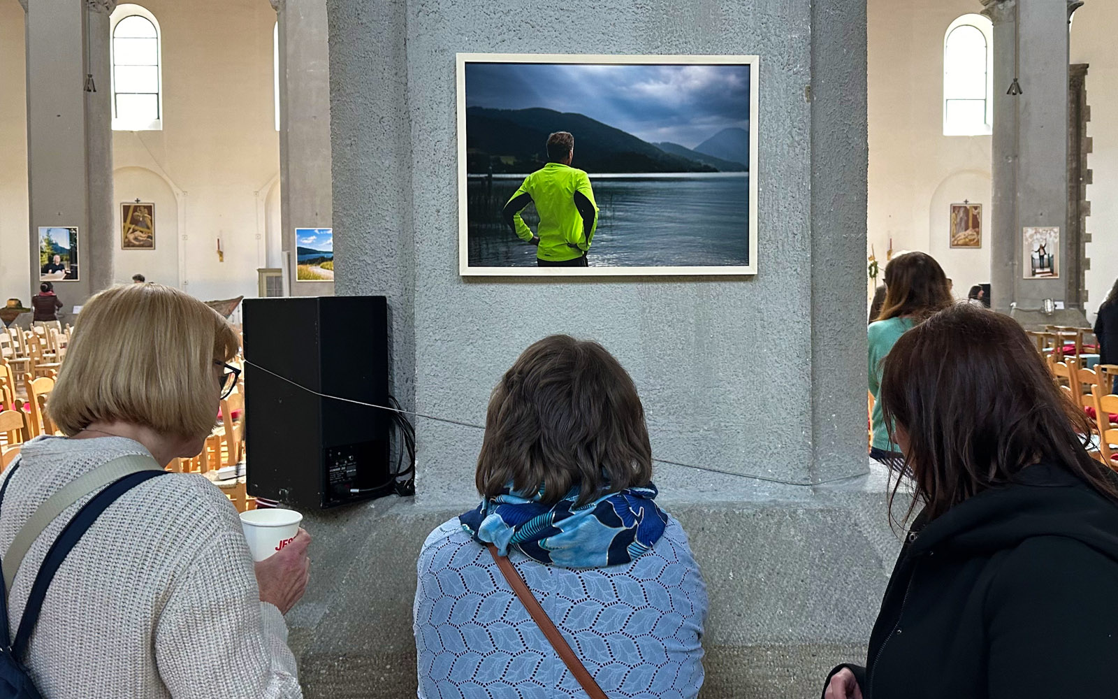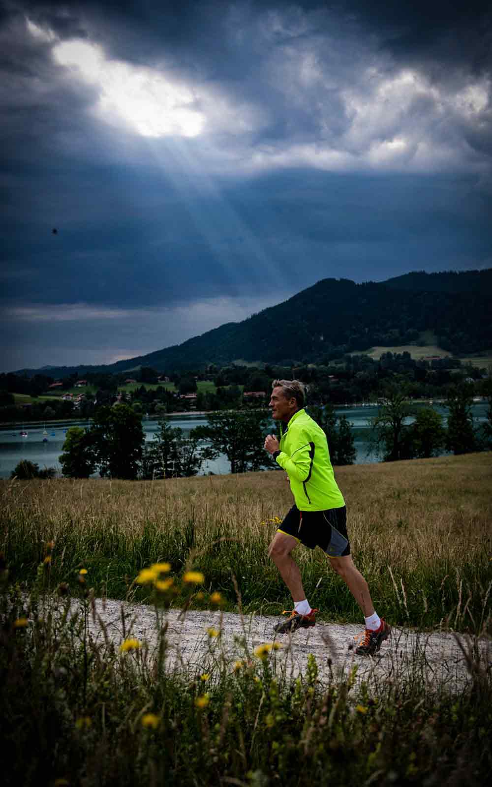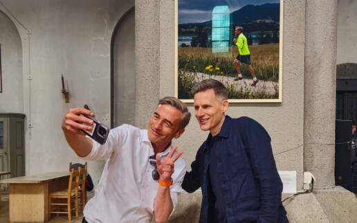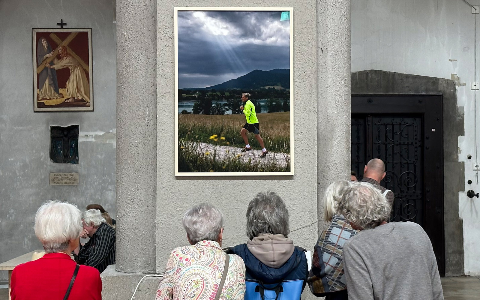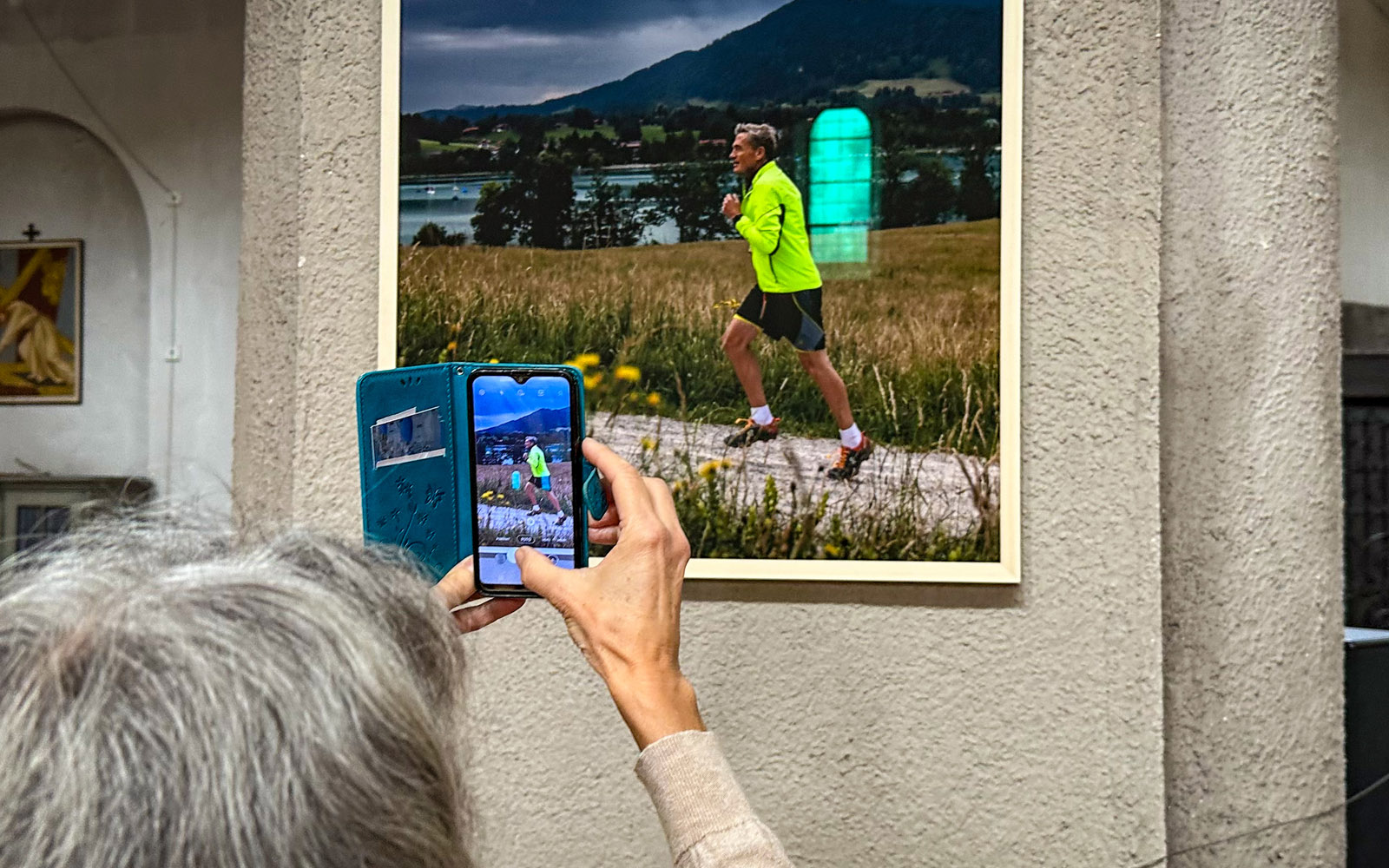 Es war kein schöner Tag am See, als Felix mit der Kamera auftaucht. Musste es aber auch nicht. Im Gegenteil: Die grimmige Wolkendecke schuf eine eigene Stimmung und hie und da kam ein Sonnenstrahl durch – nochmal eine dramatische Steigerung. Genau so einen Moment hat Felix perfekt erwischt: Stefan strampelt sich den Weg beim Gut Kaltenbrunn hoch – als ihn direkt aus dem verhangenen Himmel ein göttlicher Sonnenstrahl trifft…;-) Das Bild hängt dann auch in groß in der Kirche – und lockt die Menschen an. Und immer mittendrin: Leuchtturm Stefan mit seiner neongelben Laufjacke! Nach einer Stunde hatte Felix ordentlich Material zusammen.