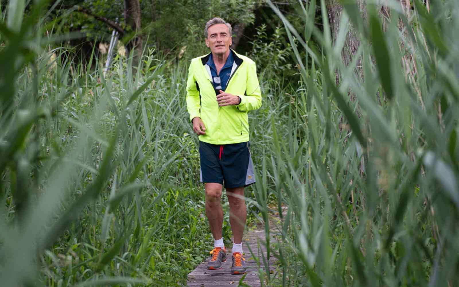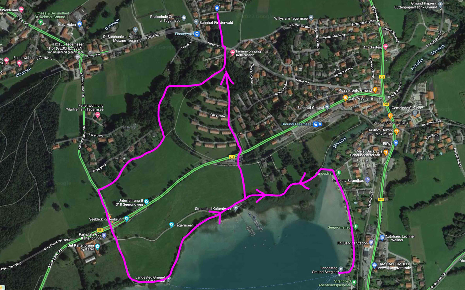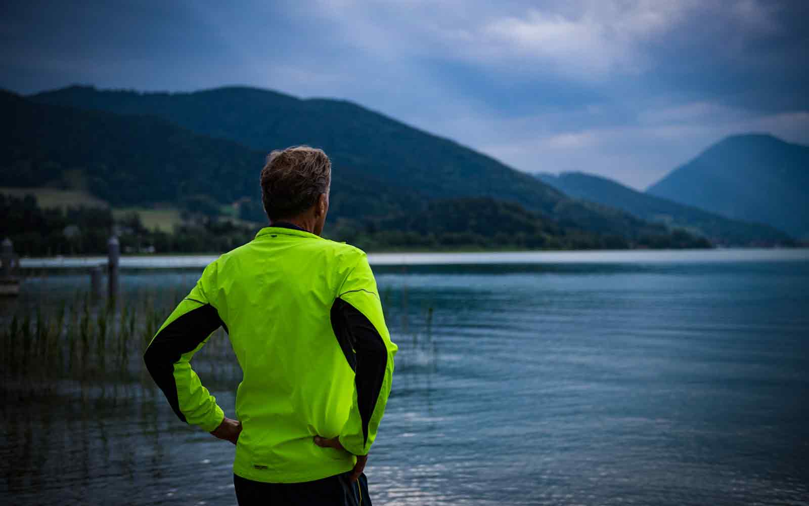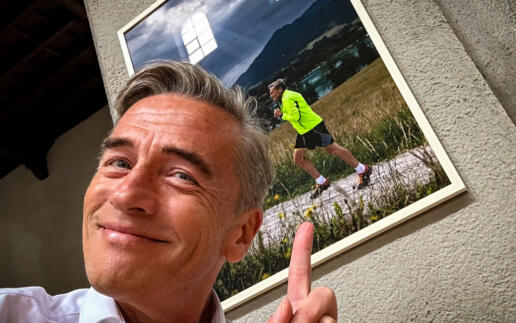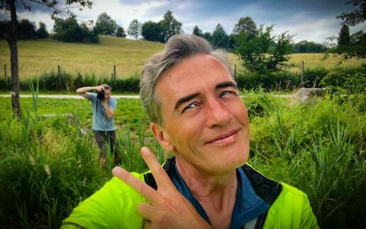 Es war kein schöner Tag am See, als Felix mit der Kamera auftaucht. Musste es aber auch nicht. Im Gegenteil: Die grimmige Wolkendecke schuf eine eigene Stimmung und hie und da kam ein Sonnenstrahl durch – nochmal eine dramatische Steigerung. Genau so einen Moment hat Felix perfekt erwischt: Stefan strampelt sich den Weg beim Gut Kaltenbrunn hoch – als ihn direkt aus dem verhangenen Himmel ein göttlicher Sonnenstrahl trifft…;-) Das Bild hängt dann auch in groß in der Kirche – und lockt die Menschen an. Und immer mittendrin: Leuchtturm Stefan mit seiner neongelben Laufjacke! Nach einer Stunde hatte Felix ordentlich Material zusammen.