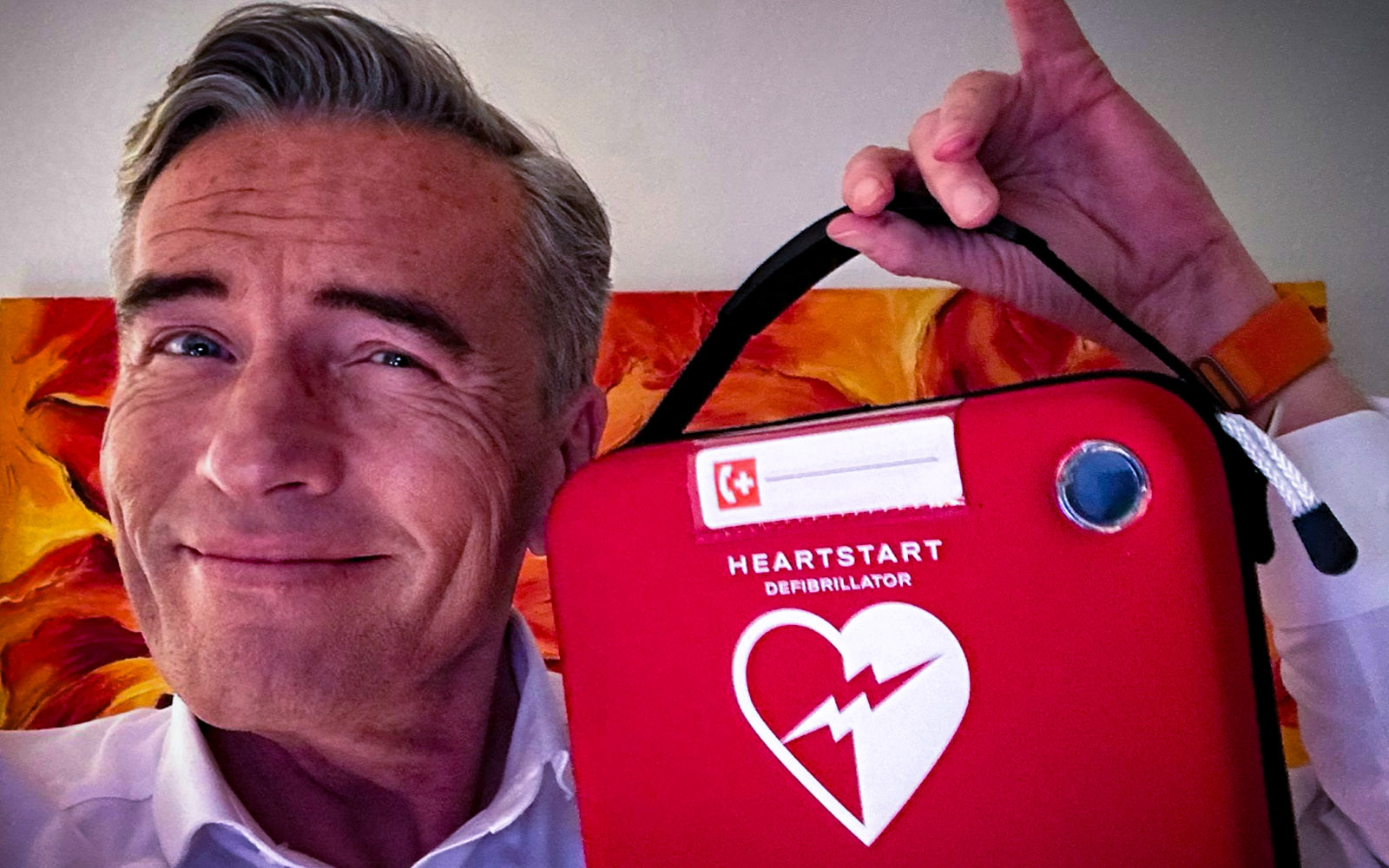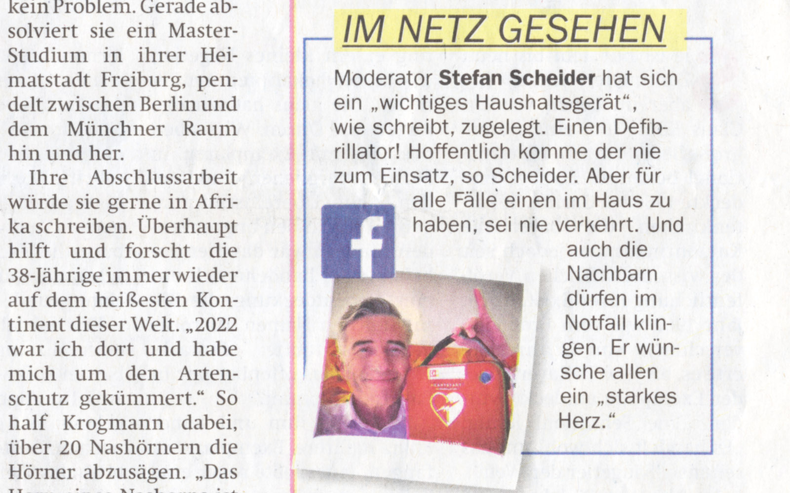 Moderator Stefan Scheider hat sich ein „wichtiges Haushaltsgerät“, wie (er) schreibt, zugelegt. Einen Defibrillator! Hoffentlich komme der nie zum Einsatz, so Scheider. Aber für alle Fälle einen im Haus zu haben, sei nie verkehrt. Und auch die Nachbarn dürfen im Notfall klin-gen. Er wünsche allen ein „starkes Herz.“