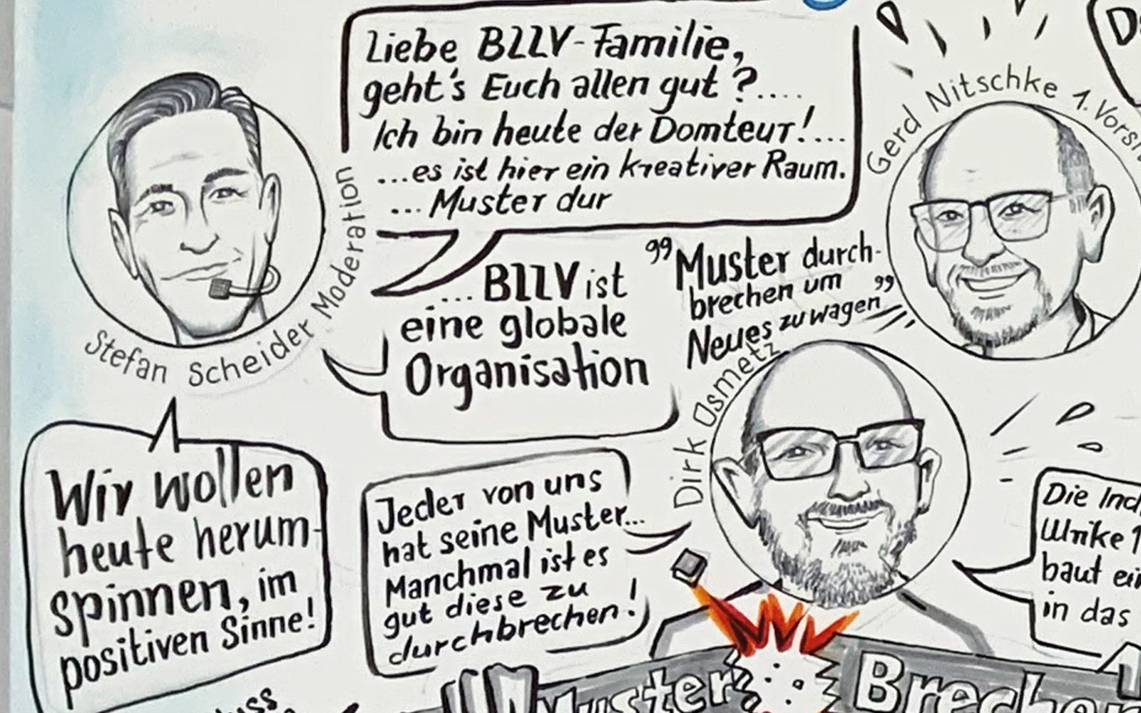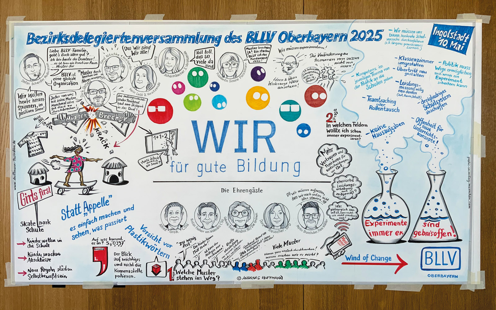 Währenddessen saugt Aktionszeichner Andreas Hoffmann jede Silbe auf – und malt ein riesiges „Wimmelbild“ aus Zitaten und Szenen. Es zeigt meisterhaft alle wichtigen Inhalte des Vormittags. Fazit nach über drei Stunden: Der BLLV muss zwar immer für seine Anliegen in den Schulen kämpfen – aber selten hat ein Moderator so eine sympathische und herzenswarme „Familie“ kennenlernen dürfen!