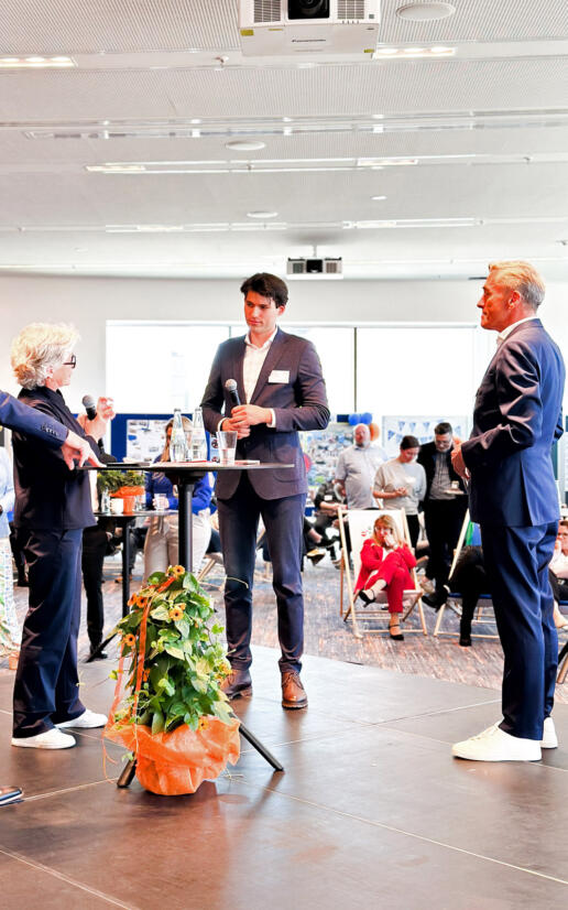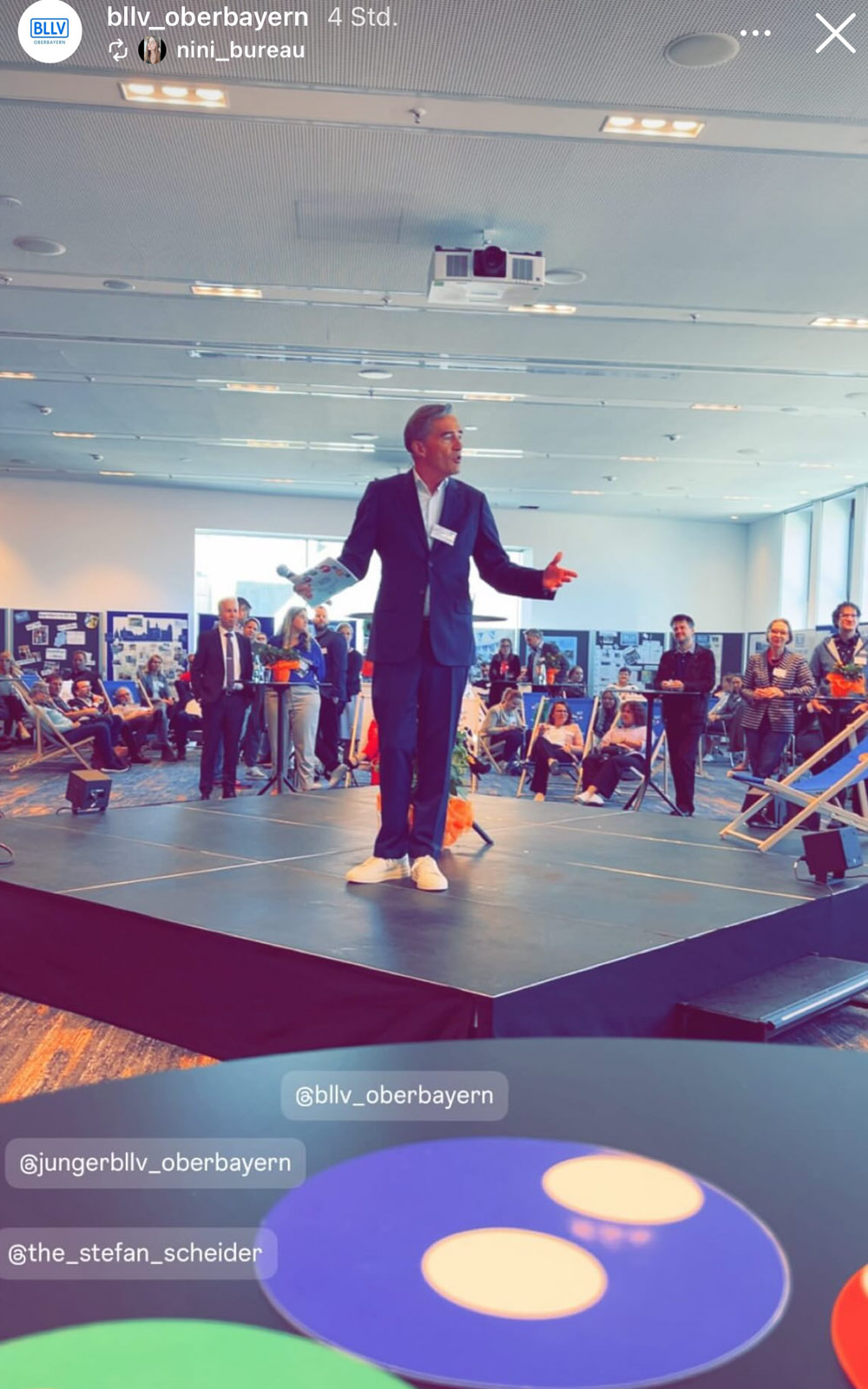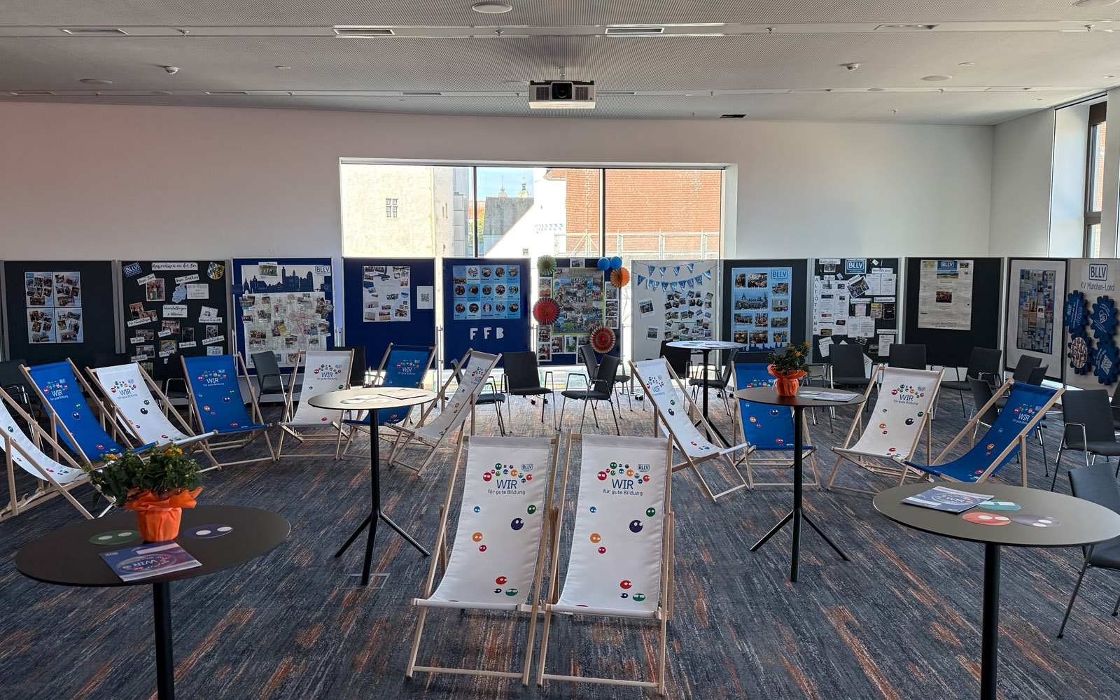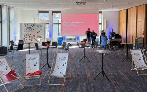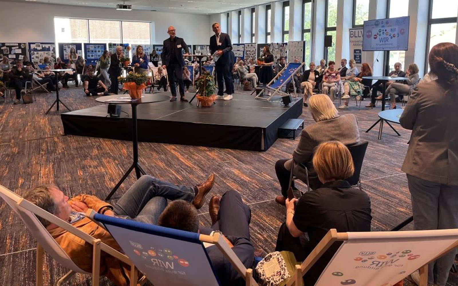 Das Setting für den „Festakt“ zeigte schon mal optisch: Wir gehen hier neue Wege! Keine Bühne ganz vorne und ordentliche Stuhlreihen im Rest des Saals – sondern eine rautenförmige Stage mitten im Saal. Heißt also für Experten und Moderator: Immer in die Richtung 360 Grad sprechen – weil wir alle mitnehmen wollen. Das Konzept kam sofort an: So war Moderator Stefan stets ringsherum von Menschen umgeben. Und die saßen auch nicht brav neben- und hintereinander, sondern locker verstreut – in BLLV-Liegestühlen, an Stehtischen oder locker hingestellten Konferenzstühlen. Aber auch inhaltlich war die Losung: Die Leute immer einbinden und zu Wort kommen lassen – und die Abläufe gut verbinden und überbrücken!