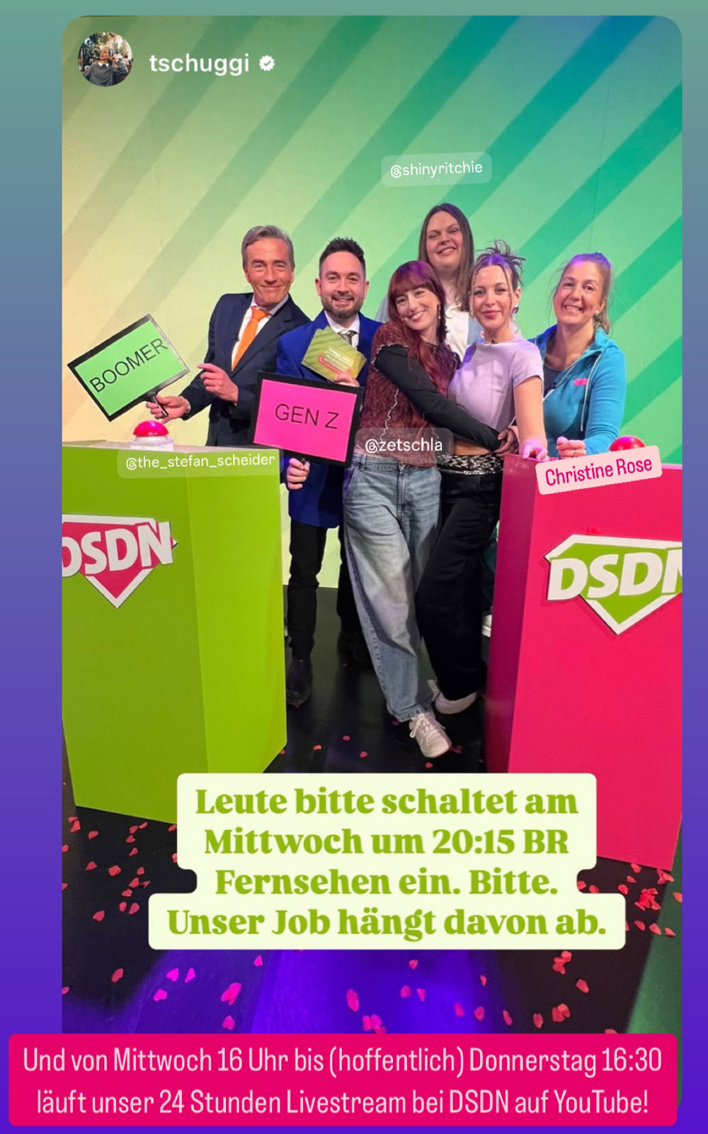 Dabei sind sie in 15 unterschiedlichen Sendungen auf allen Ausspielwegen aufgetreten. Sebastian Meinberg moderierte die „Abendschau“ im BR Fernsehen, beide versuchten sich als Fernsehköche bei „Wir in Bayern“, malten wie einst Bob Ross bei ARD alpha, führten durch das „Tagesgespräch“ auf Bayern 2 zum Thema „Was können Jung und Alt voneinander lernen?“, interviewten Thorsten Otto auf der „Blauen Couch“ in BAYERN 1, beantworteten Publikumsfragen in einer nächtlichen BAYERN 3 Call-In Sendung und talkten über Sex im PULS-Podcast „Im Namen der Hose“. Sogar bei BR Schlager im Studio Nürnberg war das DSDN-Team zu Gast – hier platzte Tschuggi in den „BR Schlager Treff“ und übernahm Tom Vieweghs Interview mit Schlagerkünstler und Ex-Dschungelkönig Joey Heindle. Zur Fernseh-Primetime im BR Fernsehen stibitzten die beiden 15 Minuten Sendezeit für die Generationen-Mini-Quizshow „Cringe, Alter“, bevor es im Regelprogramm weiterging.