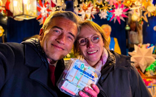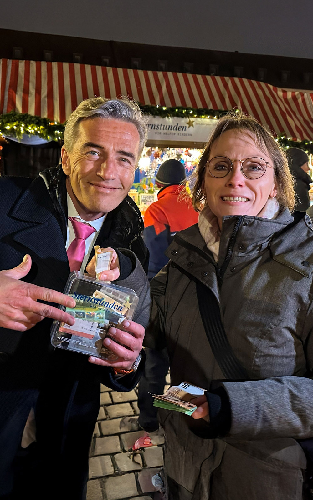 Wow – Stefan sammelt am Sternstunden-Stand auf dem Nürnberger Christkindlesmarkt und voilà: 1338 Euro fanden sich in der übervollen Spendenbox! An der Stelle ein demütiges Dankeschön an alle edlen SpenderInnen – und vor allem an meinen „Star des Abends“ Kerstin! Sie hat es in der Box ordentlich rascheln lassen – Stefan kriegt große Augen und das Herz hüpft!
