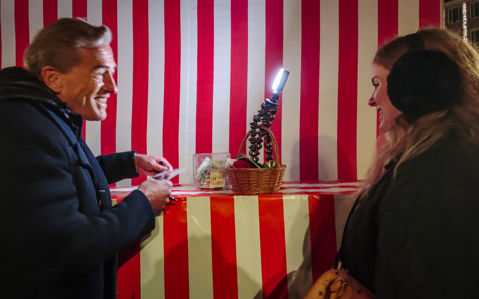 Die Stunde verging rasend schnell: Nach einem kurzen Glühwein vorher zum Aufwärmen legt Stefan los – und zack, ist die Stunde schon vorbei! Jung und alt kommen vorbei, holen Autogramme ab und hinterlassen Bares und Wahres in der Spendenbox.
